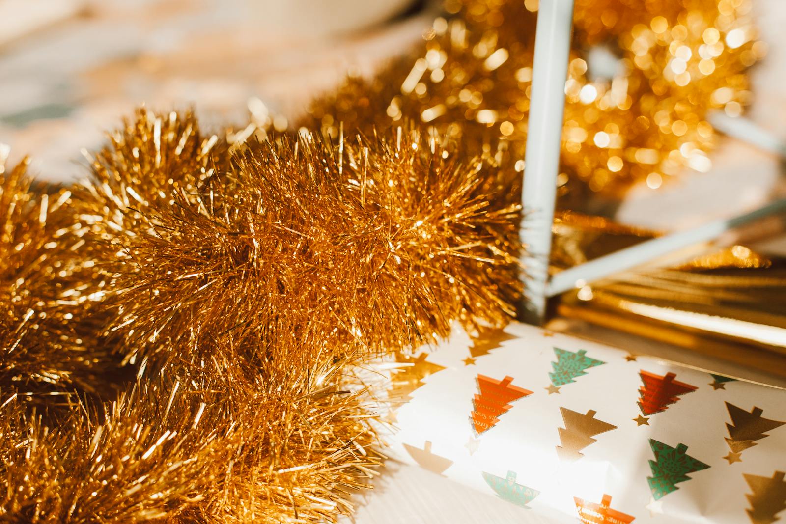 Bright gold garland paired with colorful Christmas tree wrapping paper in a close-up festive arrangement.