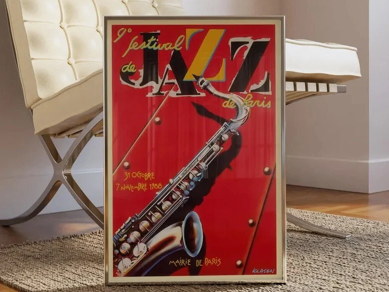 Many vintage jazz prints feature mid-century modern designs and bold colors. They make great wall art for living rooms, offices, or music rooms.