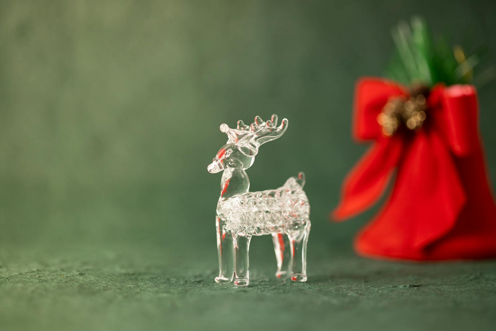 A transparent crystal reindeer ornament with a red festive decoration on a green background.